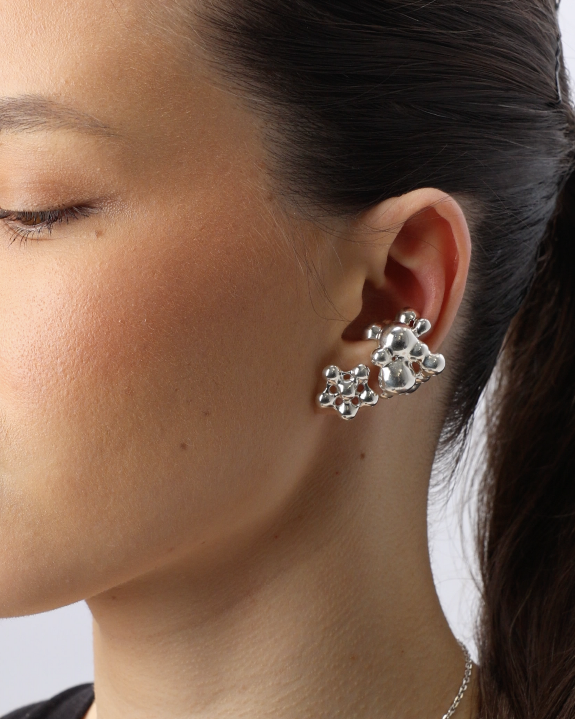 An organic, bubble-like ear cuff sculpted in sterling silver. Its fluid, clustered form wraps gently around the ear, creating a bold yet playful statement without the need for a piercing. Designed in Berlin and handcrafted in Kyiv, this piece captures the transition from digital form to physical metal — smooth, reflective, and alive with light.