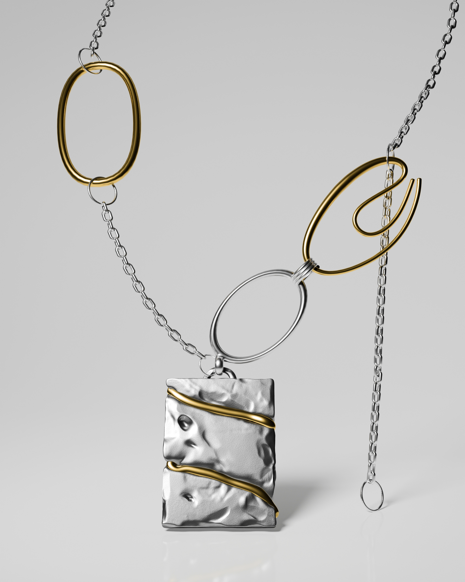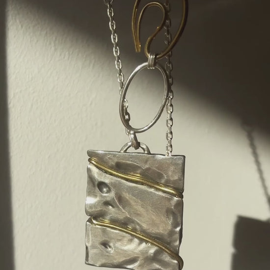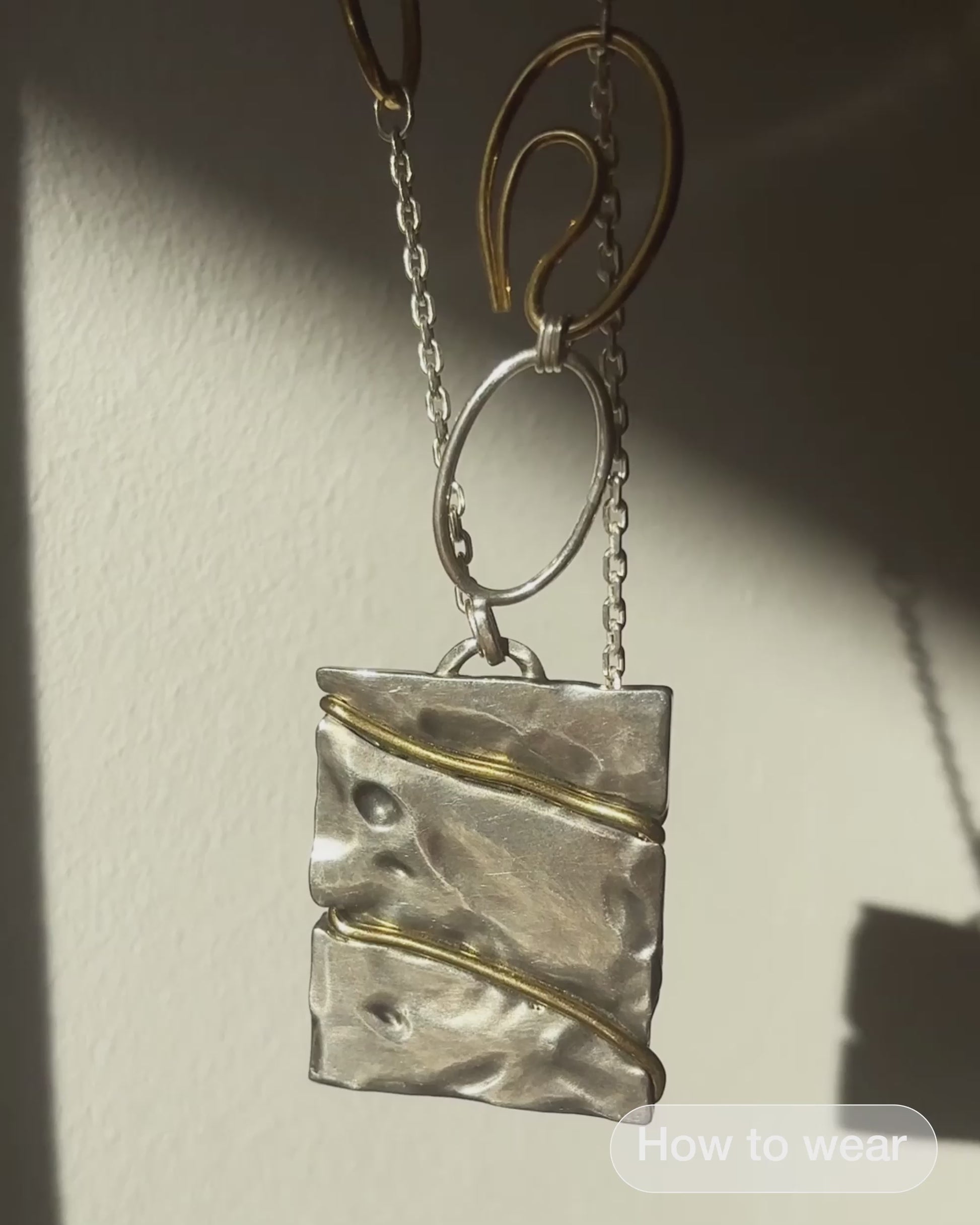 A sculptural pendant with a raw, stone-like surface — sterling silver shaped with bold texture and crossed by flowing brass accents. The piece features a unique front clasp that blends functionality with statement design. Two decorative rings on the chain allow for easy adjustment, letting you switch between a longer or shorter fit. Rock is a wearable form — powerful, textural, and confidently asymmetrical.